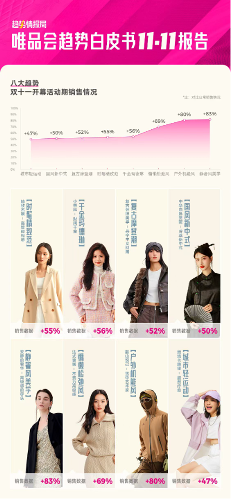 恰巧“双十一”活动本事,唯品会在进博会上初次发布《唯品会趋势白皮书11.11敷陈》。敷陈裸露,城市轻畅通、好意思丽考究范、户外机能风等潮水趋势热度攀升,有关商品销售快速增长。