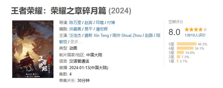 剧集《王者荣耀:荣耀之章碎月篇》共有 4 集,单集片长 30 分钟,现在豆瓣评分 8.0 分。